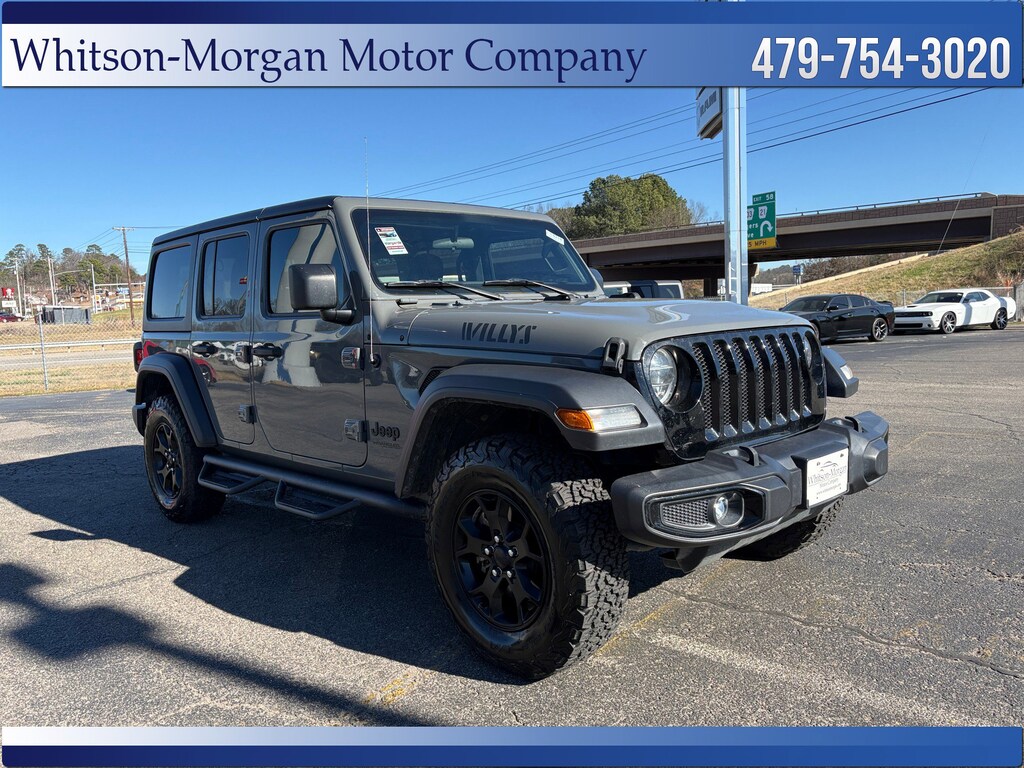 **2021 Wrangler 4dr Willy in Sting Gray Clearcoat (Great Color) ** 3.6L V6 w/ Automatic ** Heated Seats & Heated Steering Wheel ** Technology Group w/ 7 Inch Touchscreen, Apple Carplay, Android Auto, Bluetooth, Satellite Radio ** 17 Inch Black Moab Alloy Wheels w/ BFG All Terrains ** LED Headlights & LED Foglights ** Rear Vision Camera ** Remote Vehicle Start ** Remote Keyless Entry ** Automatic Climate Control ** Skid Plates ** Rock Rail Protection ** Anti Spin Rear Axle ** VERY sharp and Highly Optioned Willy Wrangler **